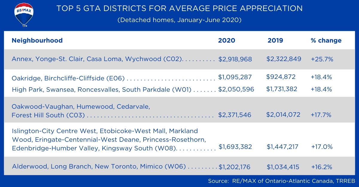 Detached housing values have shown remarkable resilience in the first half of 2020, with 95 per cent of Greater Toronto real estate districts posting solid gains in average price, according to a report released today by RE/MAX of Ontario-Atlantic Canada.